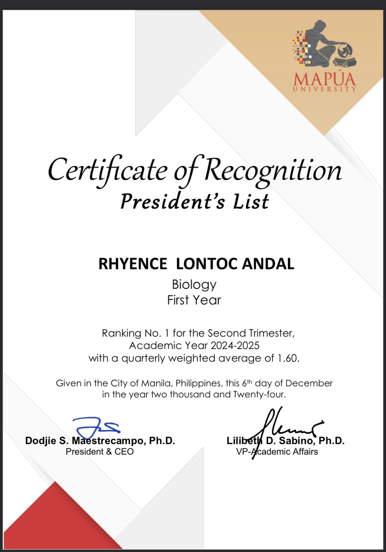 President's Lister for 3 consecutive terms in Biology program at Mapua University Makati. Ranked Top 10 in the President's Lister for the Secondterm, AY 2024-2025.